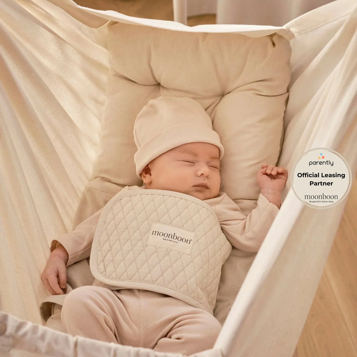 Javisst! Med Madrass Fixi från Moonboon kan din bebis sova både säkert och bekvämt. Även om det är helt normalt att ha en bebis som rör sig mycket i sömnen kan det ibland störa deras sömnmönster. Madrass Fixi är utrustad med ett lyxigt mjukt och quiltat stödbälte som varsamt håller ditt barn på plats i mitten av madrassen. Det kan hjälpa din bebis att hålla sig mer stilla och ge dig tryggheten att veta att barnet sover säkert. Madrassen passar Moonboons vagga, hängvagga och tvillinghängvagga.