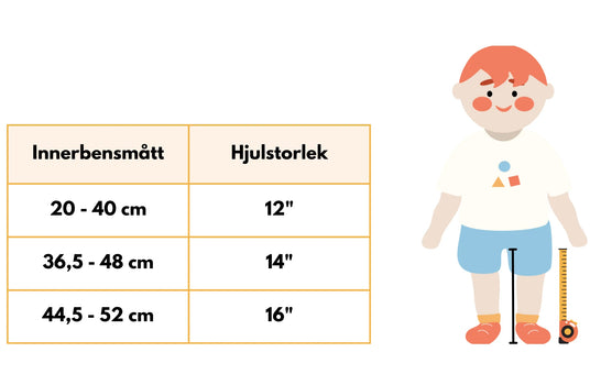 Tabellen ger en generell vägledning om vilken storlek som kan passa ditt barn baserat på innerbenslängden. Vi rekommenderar att ni även kontrollerar de specifika måtten för den cykelmodell ni är intresserade av. Här hittar du Wooms storleksguide.