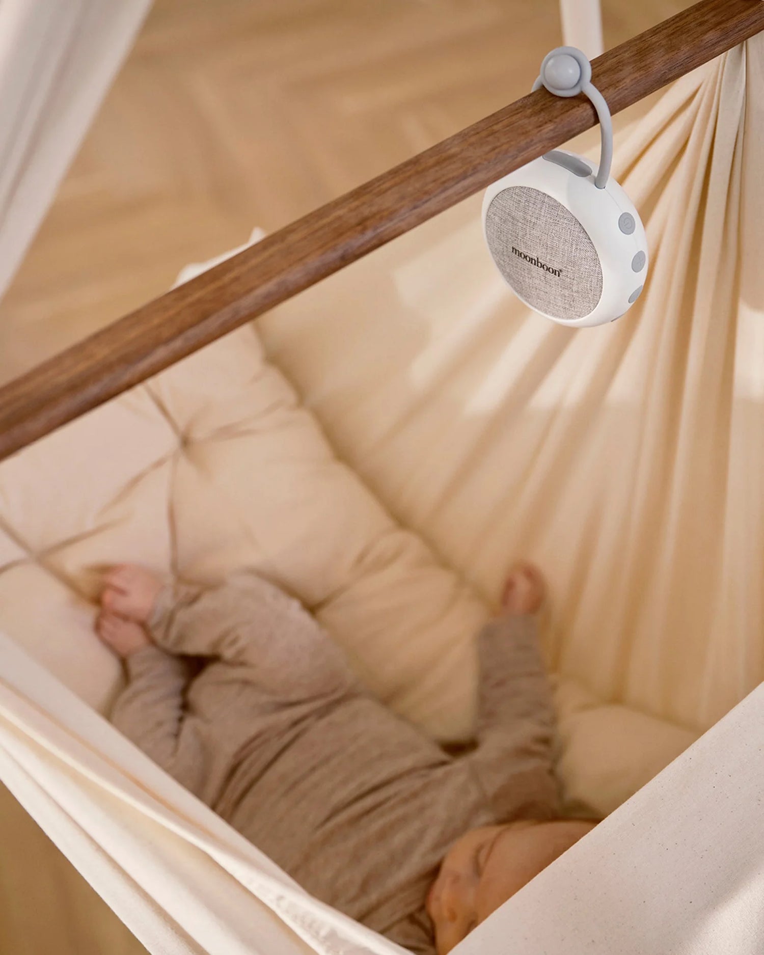 En liten högtalare som hjälper din bebis att komma till ro – välj mellan 10 olika brusljud: vitt, rosa och brunt samt livmoderljud, för en längre och bättre sömn för både dig och din bebis.