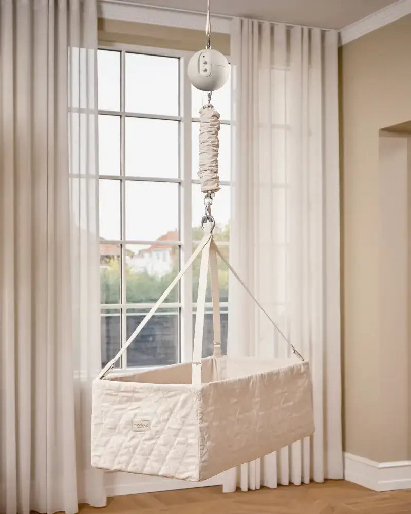 Detta allt-i-ett-paket innehåller en vagga med skummadrass, en tyst vaggmotor och din valda upphängningsmetod: stativ, takupphängning eller dörrklämma. Den mysiga vaggan med sin platta bas ger ditt barn en bekväm säng som gungas mjukt och lugnande av motorn.