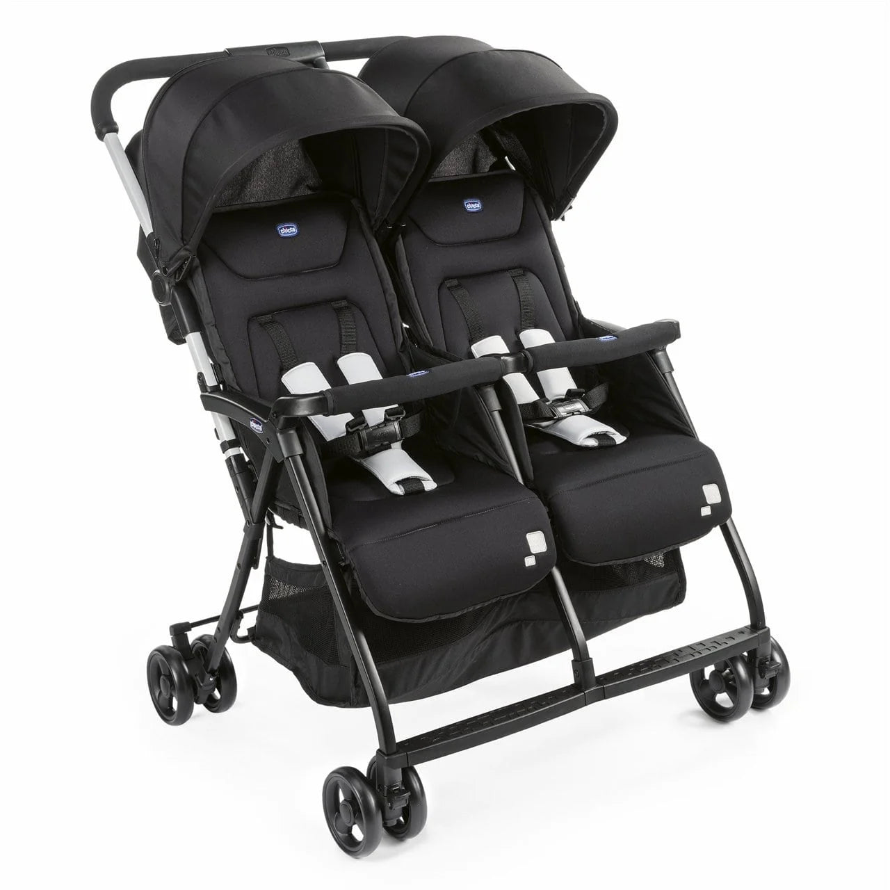 Chicco Ohlalà Twin vagnen erbjuder maximalt skydd med sitt förlängbara tak, som har ett dolt segment med dragkedja för UV/UPF 50+ skydd. De fullt justerbara sätena, fotstöden och solskärmarna ger anpassad komfort för barnen. Den stora hängande korgen erbjuder extra förvaringsutrymme för större föremål, medan regnskyddet gör att vagnen kan användas även på regniga dagar. Polstrade axelremmar och mittstång ger extra komfort, och den ultrakompakta hopfällningen med ett handgrepp gör förvaring enkel. Vagnen står självständigt när den är hopfälld – perfekt för korttidsuthyrning.