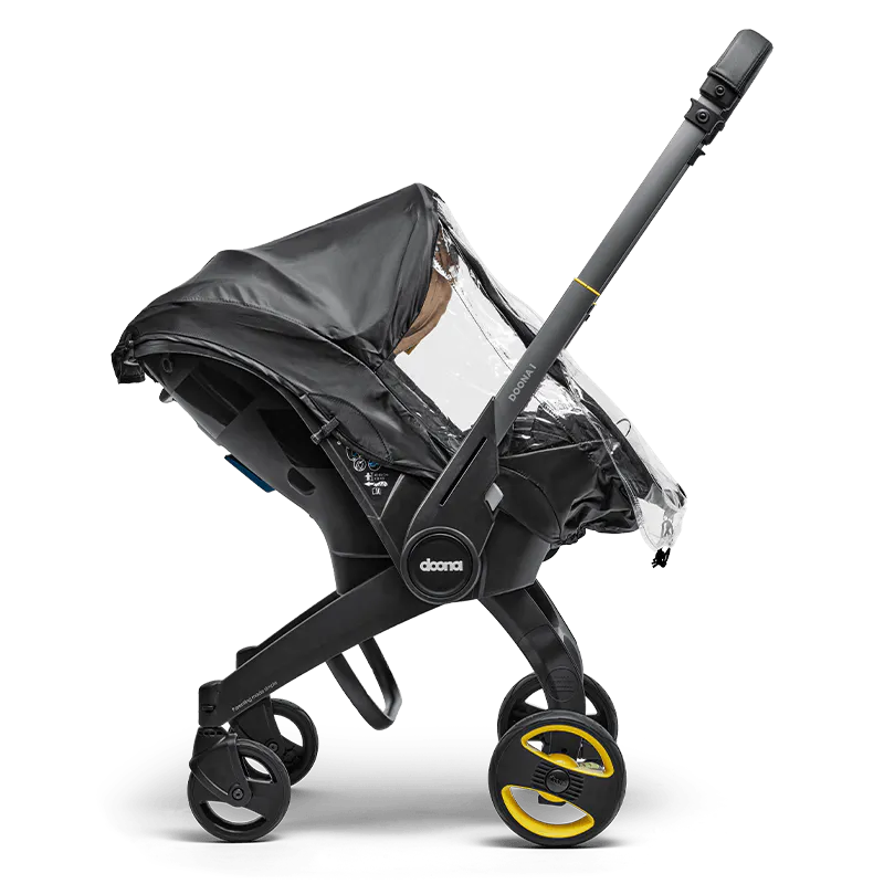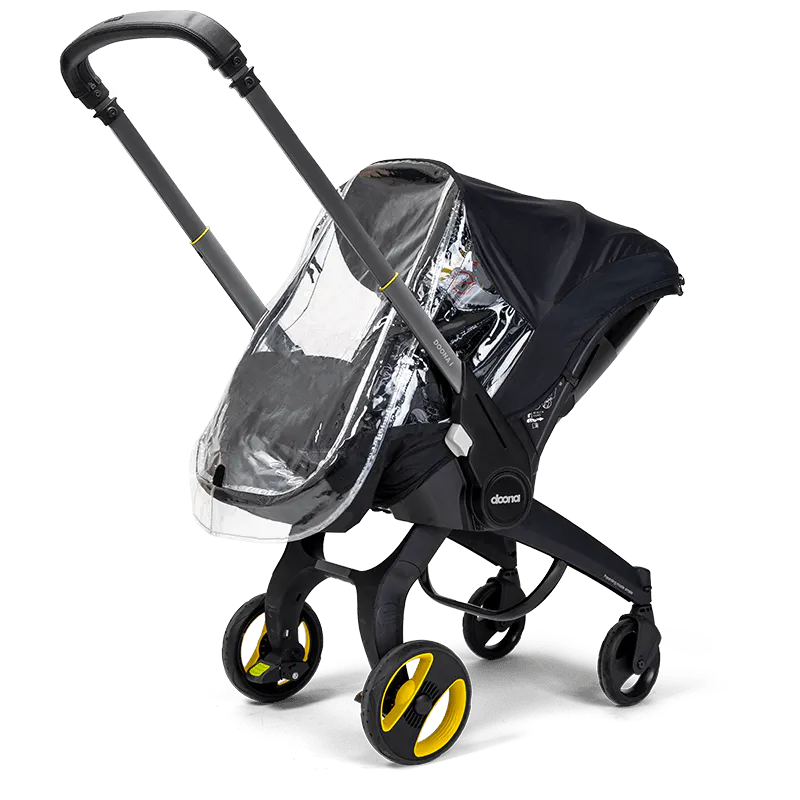 The Doona i Rain Cover provides safety, comfort, and dryness for your baby, made from baby-safe materials with side ventilation holes for excellent airflow. The wide zipper opening offers easy access, while the snap-on Doona connectors simplify attachment and removal. A compact carry bag is included for convenient storage.